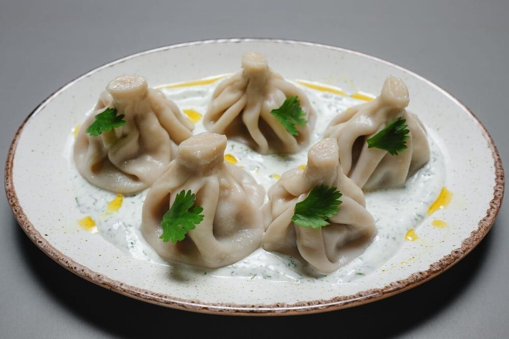 Хинкали с говядиной и свининой с чесночным соусом