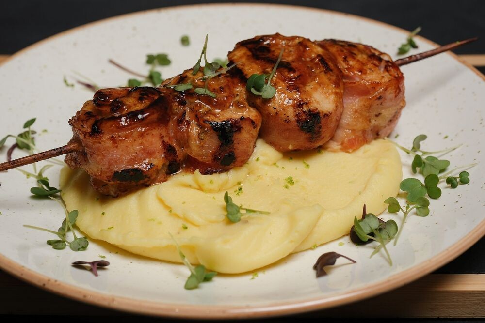 Креветки на шпажке с беконом и ананасом под соусом сладкий чили