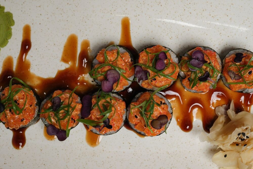 Рис, нори,сыр, лист салата,огурец,лосось, тобико, кунжут.
