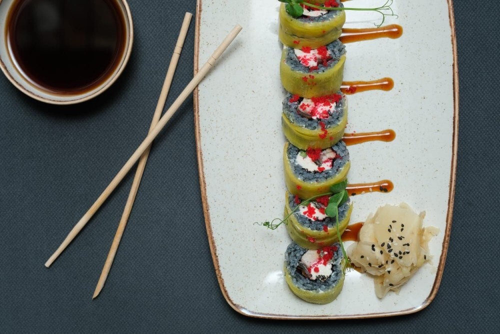 Рис, сыр сливочный, огурец, угорь, кунжут, дайкон
