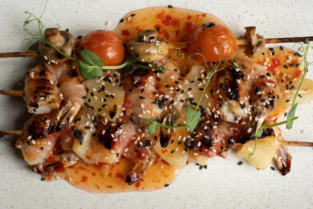 Креветки на шпажке с беконом и ананасом под соусом сладкий чили