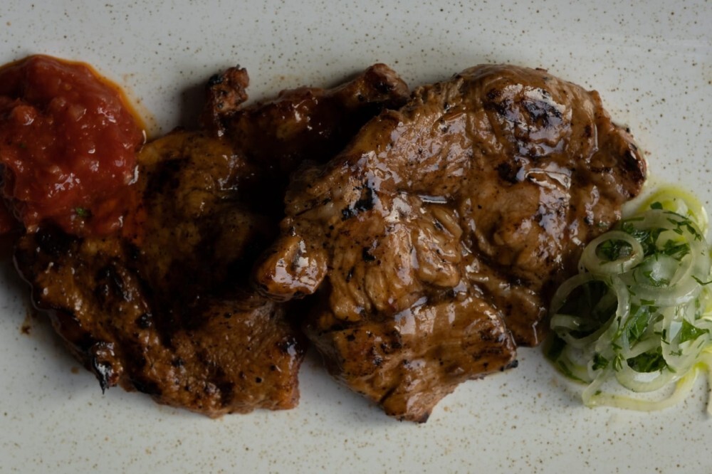 Креветки на шпажке с беконом и ананасом под соусом сладкий чили